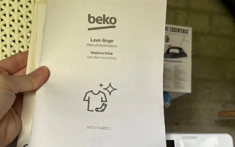 Wasmachine, droger, handleiding droger en wasmachine op de wasmachine. Een wasmand, een strijkijzer met mini strijkplank, extra koelkast, kinderstoel, de stofzuiger, schoonmaakspullen en wasmiddel.